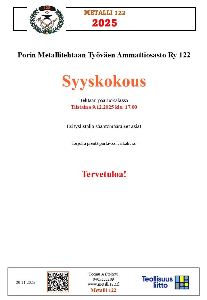 Porin Metallitehtaan Työväen Ao. 122 Ry on aktiivinen, reilu 1300 jäsenen Teollisuusliittolainen ammattiosasto. Osasto mm. valvoo jäseniensä etuja seka tarjoaa runsaasti erilaisia tapahtumia ja aktiviteettejä aina perinteisestä Särkänniemen perheretkestä vaikkapa kalankäsittelykurssiin. Mikään idea koulutuksesta tai muusta tapahtumasta ei välttämättä ole mahdoton!