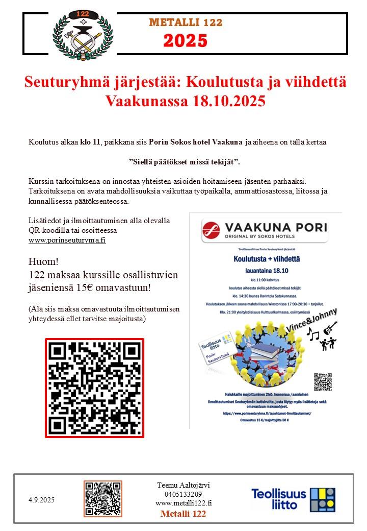 Porin Metallitehtaan Työväen Ao. 122 Ry on aktiivinen, reilu 1300 jäsenen Teollisuusliittolainen ammattiosasto. Osasto mm. valvoo jäseniensä etuja seka tarjoaa runsaasti erilaisia tapahtumia ja aktiviteettejä aina perinteisestä Särkänniemen perheretkestä vaikkapa kalankäsittelykurssiin. Mikään idea koulutuksesta tai muusta tapahtumasta ei välttämättä ole mahdoton!