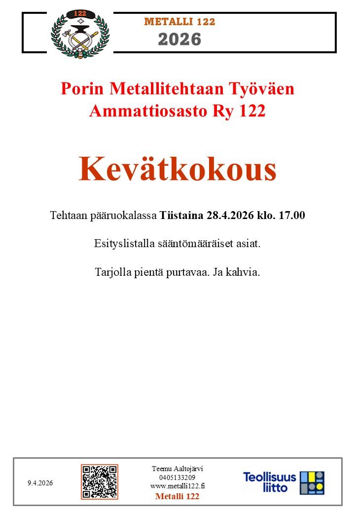 Porin Metallitehtaan Työväen Ao. 122 Ry on aktiivinen, 1300 jäsenen Teollisuusliittolainen ammattiosasto. Osasto mm. valvoo jäseniensä etuja seka tarjoaa runsaasti erilaisia tapahtumia ja aktiviteettejä aina perinteisestä Särkänniemen perheretkestä pilkkikilpailuihin. Mikään idea koulutuksesta tai muusta tapahtumasta ei välttämättä ole mahdoton!
